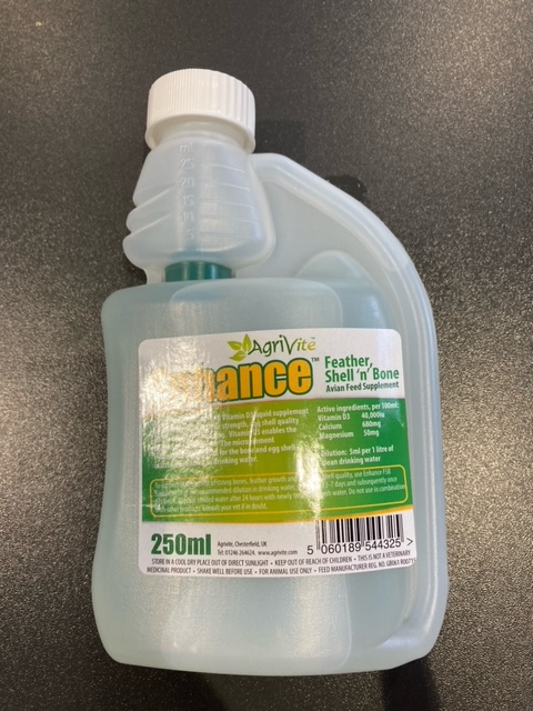 Enhance Feather, Shell 'n' Bone 250mlOriginal price £7.50 - Original price £7.50Original price£7.50£7.50 - £7.50Current price £7.50| /1 reviewAgrivite Enhance Feather| Shell 'n' Bone 250ml. An intensive Calcium, Magnesium and Vitamin D3 liquid supplement For development of bine strength... View full details